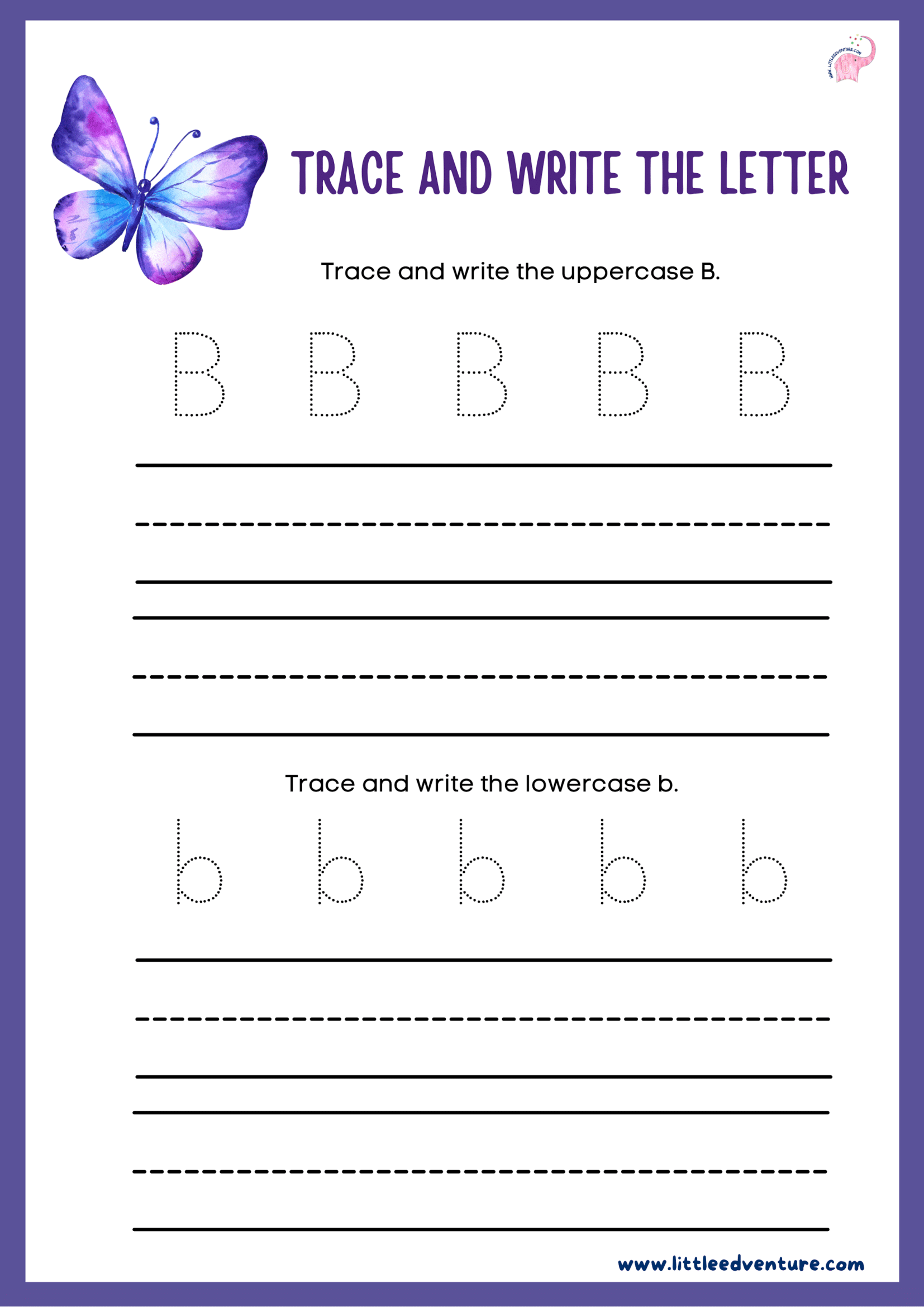 This engaging book introduces the letter B through colorful illustrations, tracing activities, and delightful mini stories featuring Ball, Banana, and Butterfly — making phonics and early writing practice exciting for little learners!