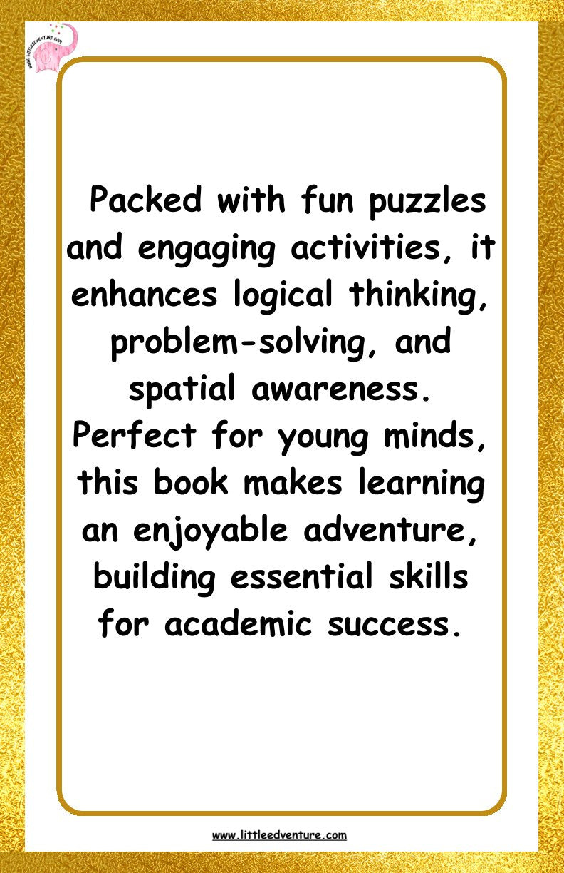 Packed with fun puzzles and engaging activities, this book is designed to boost logical thinking, problem-solving, and spatial awareness in children. Perfect for young minds, it transforms learning into an enjoyable adventure while building essential skills for academic success. A great way to make education both fun and rewarding!